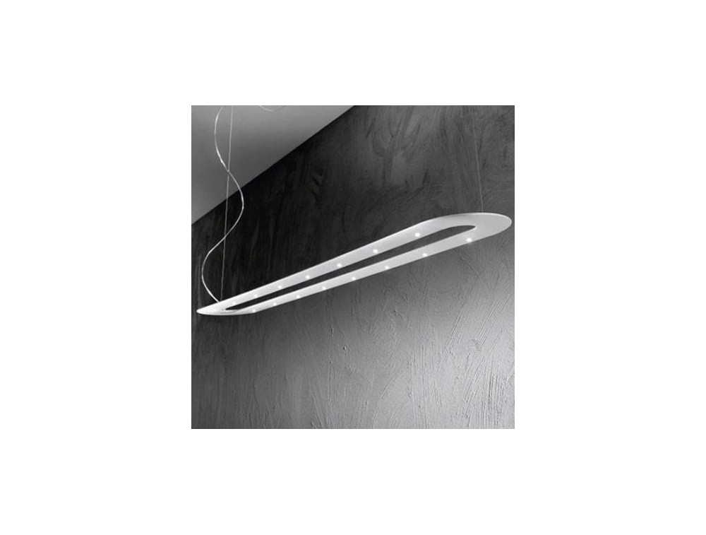 LED-Pendelleuchte mit weiß lackierter Aluminiumstruktur. Lampe mit einem einfachen und eleganten Design, perfekt für moderne Umgebungen dank der Form seines Diffusors erinnert an ein O, in dem Elemente von LED-Licht installiert sind. Ideal in Büros, Ruhezonen, Wohnzimmern, Wohnzimmern und Fluren.