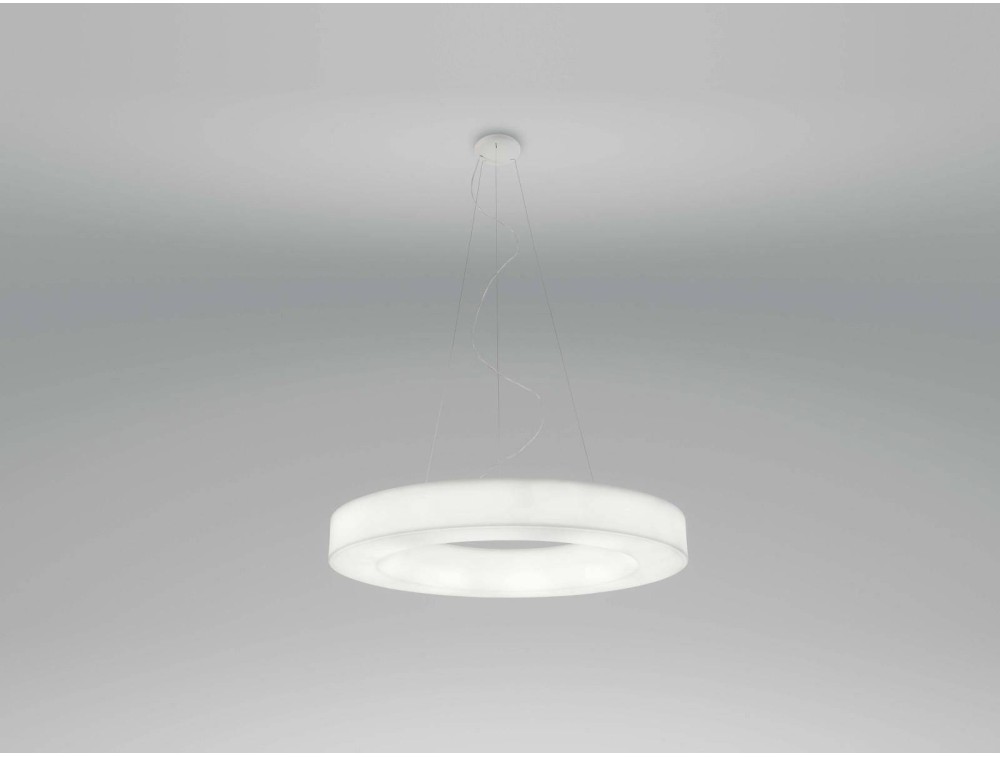 LED-Pendelleuchte aus einem Eisenkörper und einem kreisförmigen Polyethylen-Diffusor in der Mitte gebohrt. Ein leuchtender Plenarring schwebt in der gedämpften Luft von geräumigen Umgebungen. Sie ist perfekt für die Beleuchtung von Showroom, großen Hotelsälen, Geschäftsräumen und großen öffentlichen Räumen. Verfügbar in warmem oder natürlichem Licht.