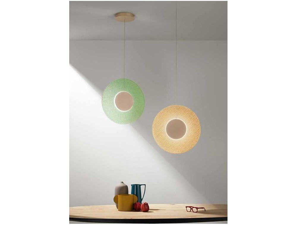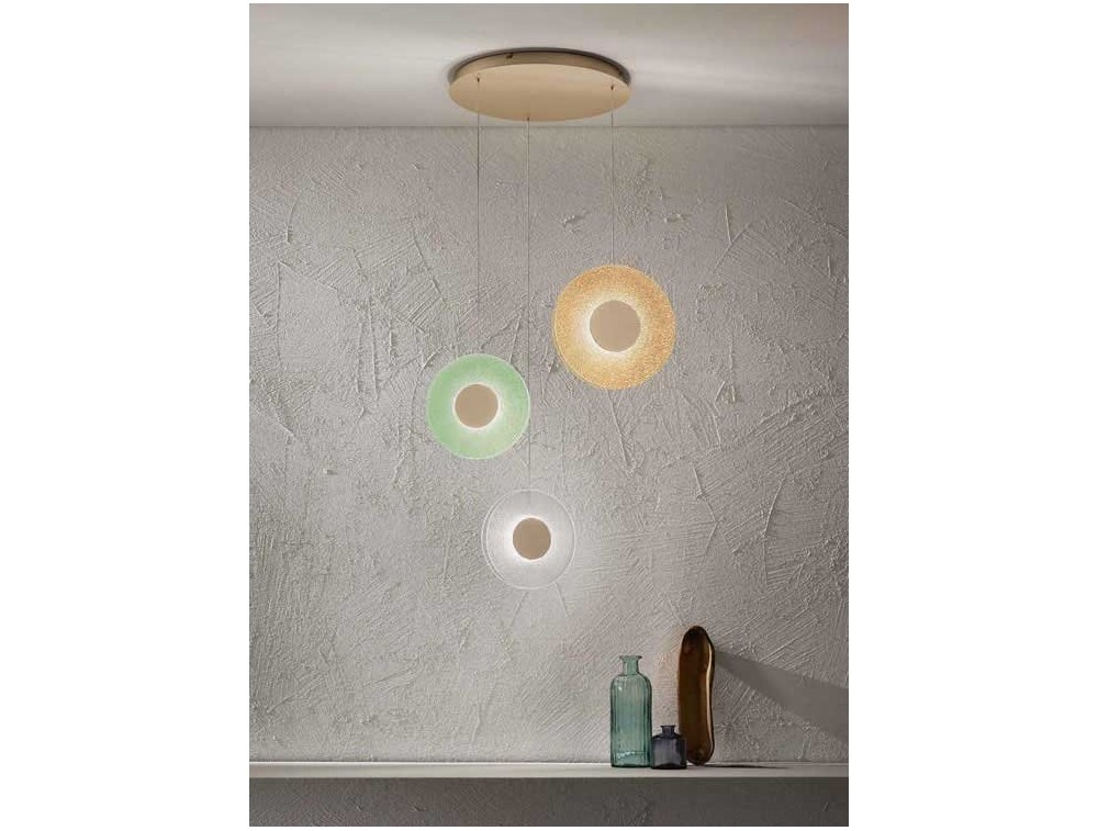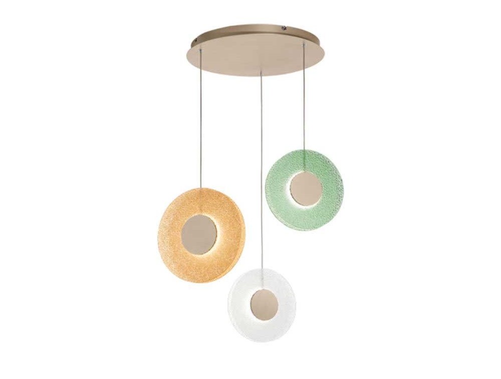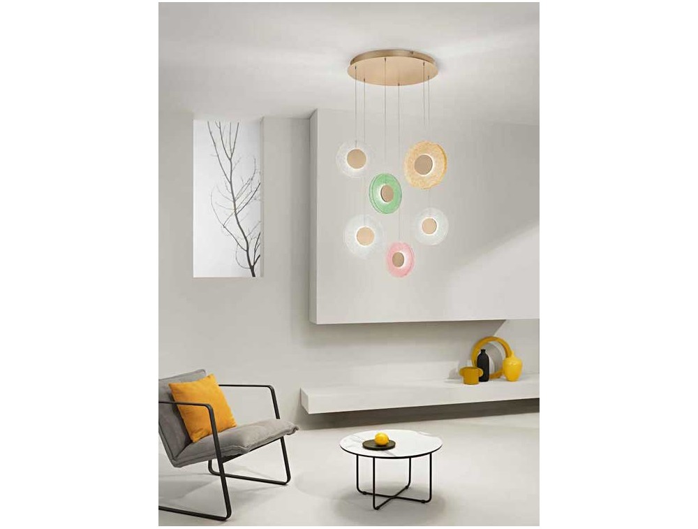 Kronleuchter aus Glas mit kreisförmigen Diffusoren: transparent, grün, bernsteinfarben und rosa, der für diffuses und intensives Licht sorgt. Sockel aus goldfarbenem Metall