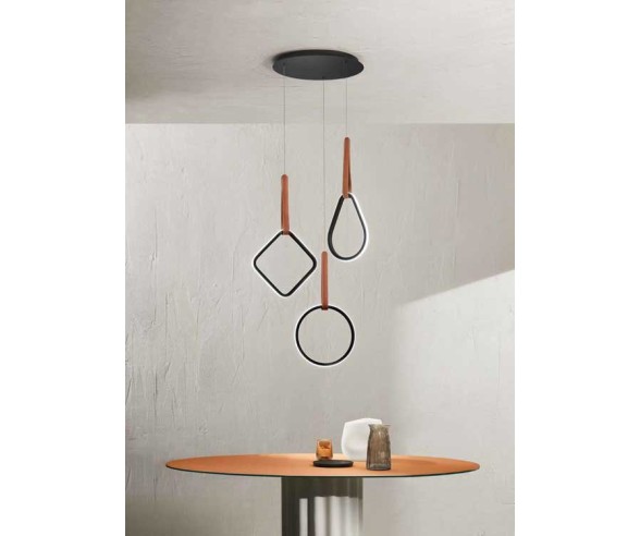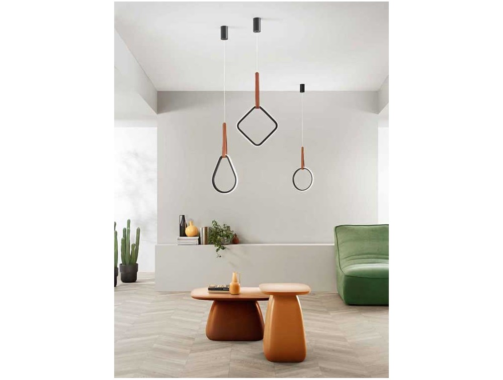 Regoli-Pendelleuchte aus schwarz lackiertem Metall mit Details aus Kunstleder. Trotz ihrer sehr geringen Dicke und dem minimalistischen Design eine besonders helle, moderne Hängelampe.