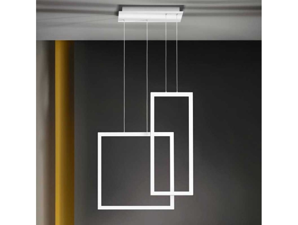 Pendelleuchte aus der Cross-Kollektion von Perenz Beleuchtung mit einer weiß lackierten Struktur aus Aluminium und Acryl-Diffusoren. Pendelleuchte eines neuen Designs mit geometrischen Quadraten, die den Raum indirekt beleuchten und gleichzeitig ausstatten. Das Layout der Quadraten kann nach Ihrem Geschmack oder Ihren Bedürfnissen angepasst werden. Mit dem integrierten LED-Modul können Sie erhebliche Energieeinsparungen erzielen.