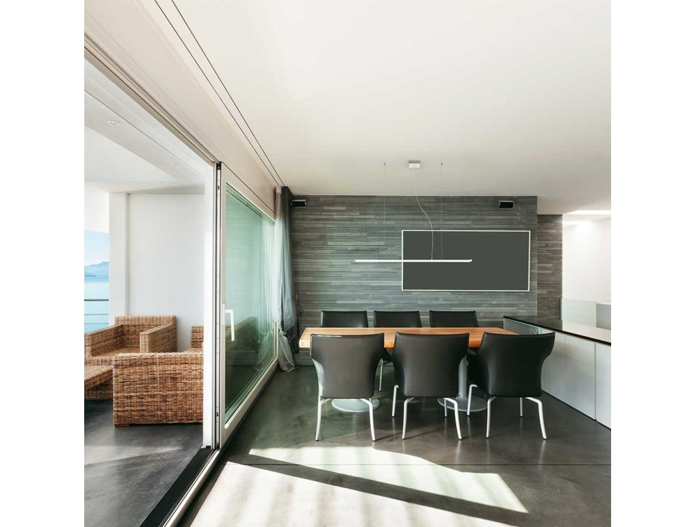 Moderne LED-Hängelampe mit Diffusor entlang der beiden längeren Seiten, montiert auf einer mattweiß lackierten Metallstruktur.
