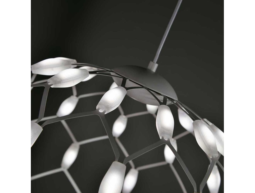 Kronleuchter bestehend aus einer Aufhängung aus Weißmetall, die mit einem Spinnennetz verwoben ist, das durch Mini-LED-Schaltkreise verteilt ist.