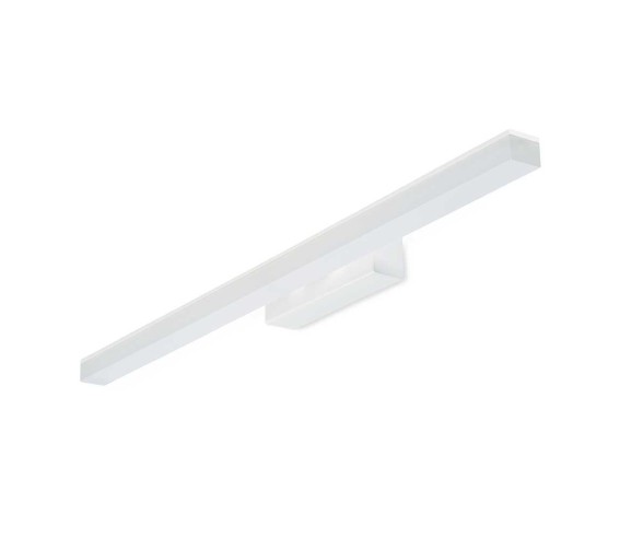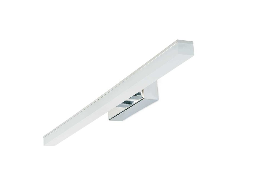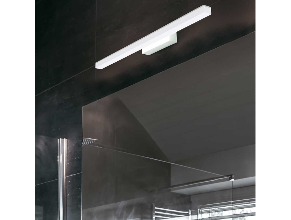 Lineal Wandleuchte aus einem weißen oder verchromten Metallrahmen, auf dem ein satinierter Acryldiffusor angebracht ist, der das Licht nach unten projiziert.