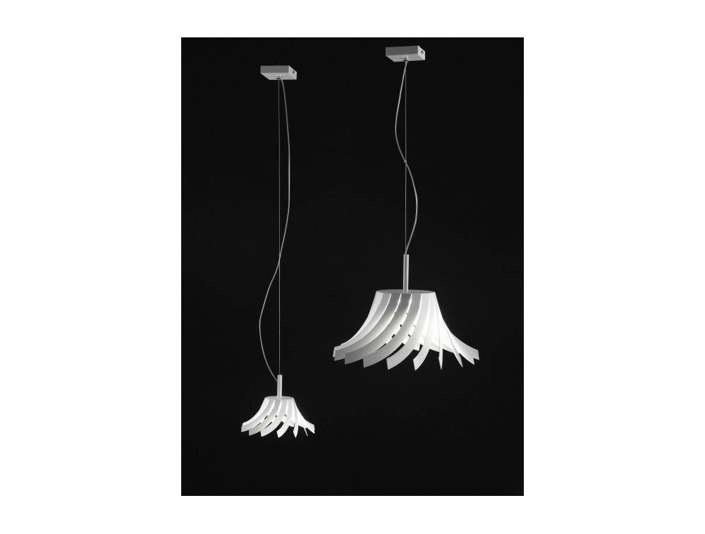 Moderner LED-Pendelleuchte mit Struktur und Diffusor aus weißem, lasergeschnittenem Metall. Lampe mit einem raffinierten Design, das dank des Laser-Cut-Diffusors eine große Klappe mit Fransen erzeugt. Lampe inspiriert von den Regenschirmen aus gewebter Palmfaser des Ecuador. Helle Lampe in zwei Größen erhältlich.