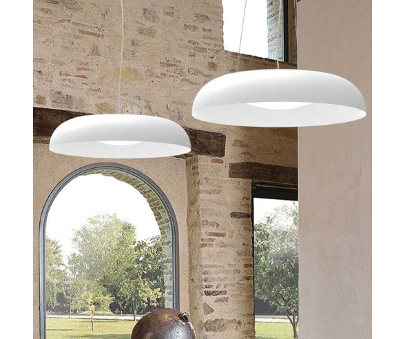 Hochmoderne Federung, die den Raum beleuchtet und dekoriert. Eine Hängelampe mit weißem Metallrahmen und weißem Glasdiffusor.