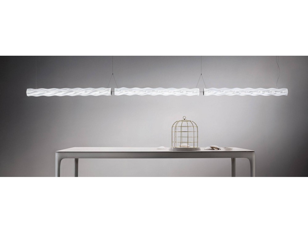 Die Pendelleuchte in der angenehmen und vielseitigen seidigen weißen Farbe passt die Umgebung mit einem kurvigen Design und mit der Weichheit des LED-Lichts, das durch das aufgedruckte Technopolymer gleichmäßig verteilt wird, an. Die Anordnung von Hugo in Längsrichtung oder in freier Reihenfolge ist eine individuelle Entscheidung, die sich sowohl für ein dekoratives als auch für ein Beleuchtungsprojekt eignet
