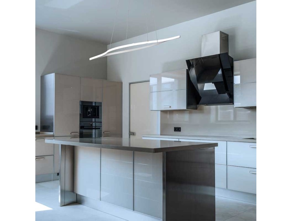 Eine neue Lampe von Vivida International, mit einem modernen und neuen Design, perfekt für die Platzierung in allen Räumen Ihres Hauses, für eine vollständige Beleuchtung, die sich seitlich ausbreitet. Diese besondere Lampe ist technologisch auf der Höhe der Zeit für eine moderne Küche, sie ist mit einem integrierten dimmbaren LED-Licht ausgestattet, mit Interaktion über die mitgelieferte Fernbedienung, um die Intensität des Lichts und die Farbe variieren zu können und zwischen den Kelvin-Farbtönen zu wählen : 3000k- 4000k-6000k, aber Sie können die TUYA-App herunterladen, um sie über Mobiltelefon oder Tablet oder mit Sprachgeräten wie Amazon Alexa oder Google Assistant zu steuern. Hergestellt aus weiß lackiertem Aluminium mit satinierter Silikonabdeckung, die als Sichtschutz für das LED-Licht dient, um die Sicht nicht zu stören, wenn Sie darauf schauen. Die Kabel sind Höhenversteller, um sie entsprechend Ihren verschiedenen Bedürfnissen zu positionieren.