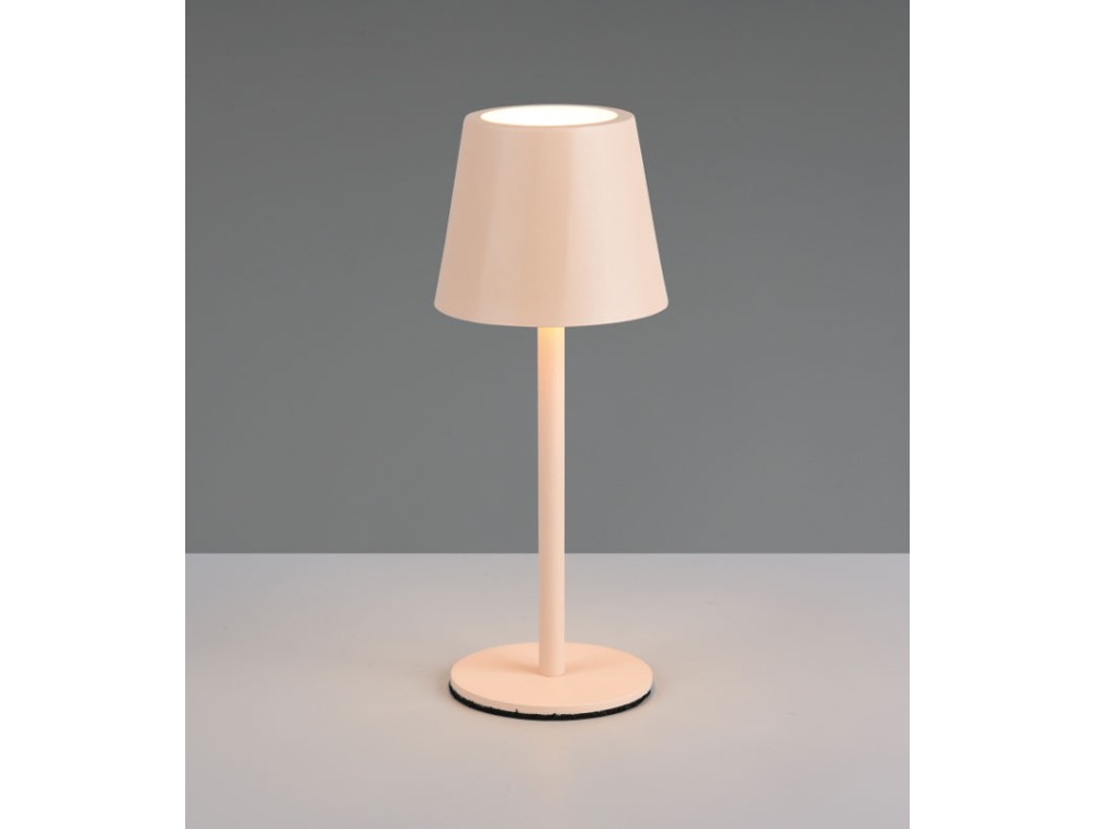 Tragbare LED-Lampe mit Dimmfunktion, gefertigt aus Metall in Sand-, Weiß-, Schwarz-, Grau- und Pistazienfarben. Dreistufiger Touch-Schalter zur Helligkeitsregulierung. Schutzart IP44.