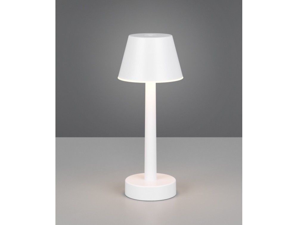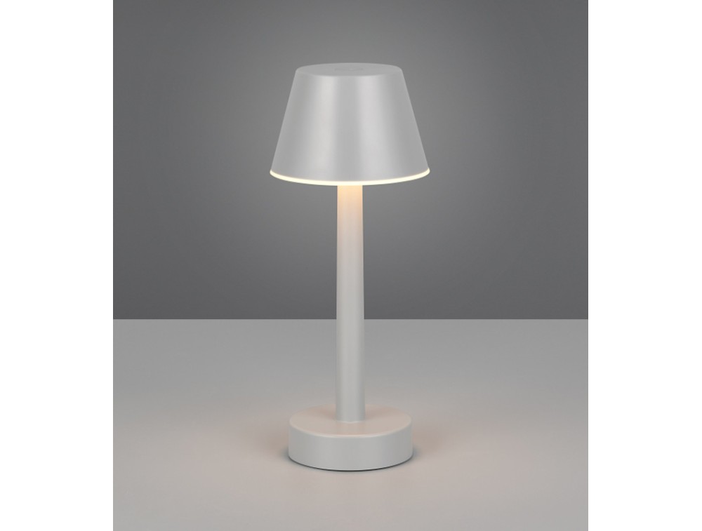 Tragbare LED-Lampe aus weißem, schwarzem und grauem Metall. Dreistufiger Touch-Schalter zur Helligkeitsregulierung. Schutzart IP44. Wiederaufladbarer Akku und 5 Jahre Garantie auf die LED.