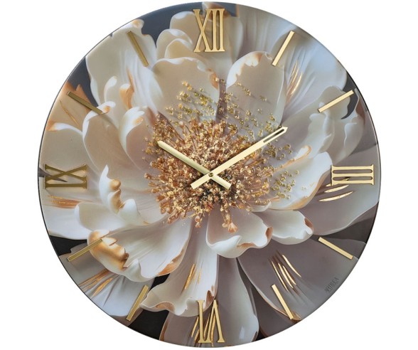 Eine atemberaubende Wanduhr – eine florale Explosion in einer neutralen und doch luxuriösen Farbpalette. Sie passt perfekt zu eleganten, neutralen, glamourösen und minimalistischen Einrichtungsstilen, bei denen der Kontrast zwischen der Schlichtheit des Raumes und der Opulenz des Zifferblatts einen raffinierten Effekt erzeugt. Kostenloser Versand und 2 Jahre Garantie.
