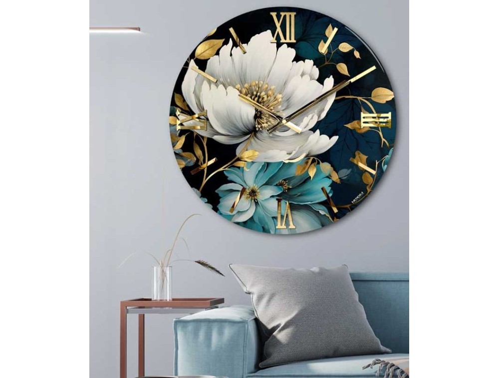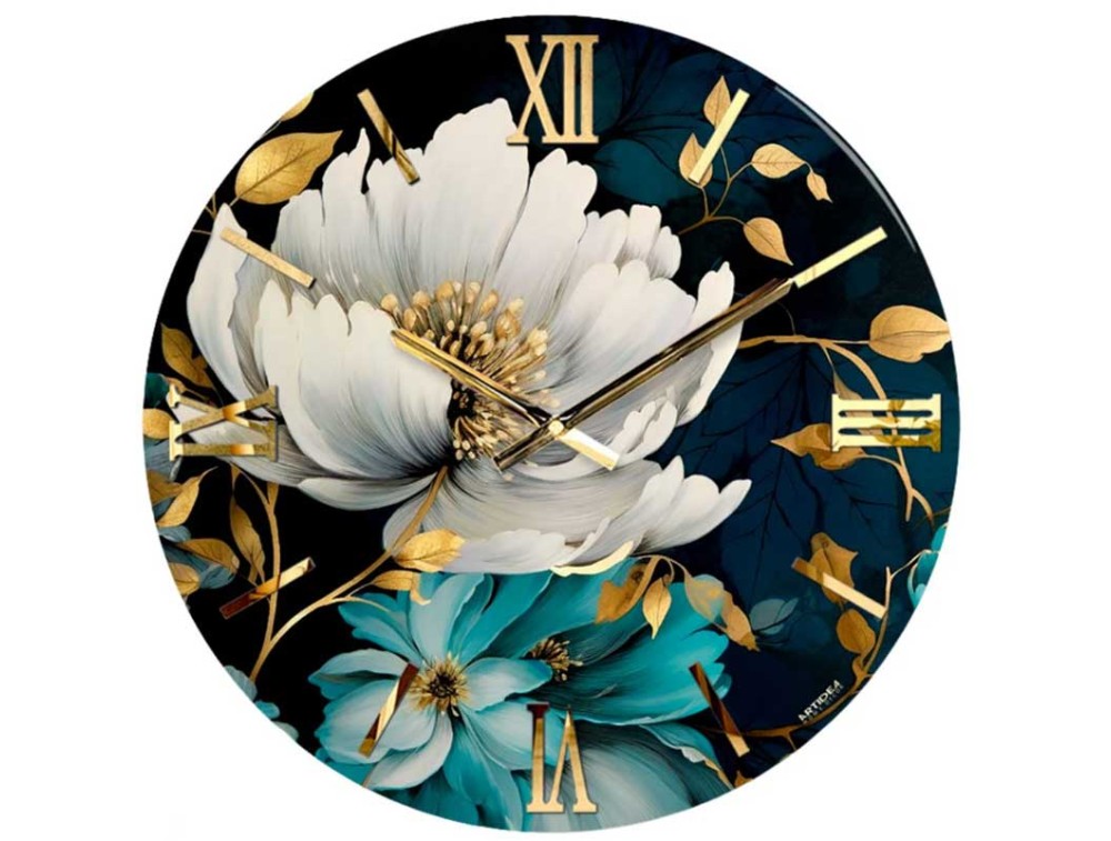 Runde Uhr mit poliertem Zifferblatt, handverziert mit Blattgold und überlappenden römischen Ziffern aus poliertem Plexiglas mit Spiegeleffekt. Polierte Metallzeiger.