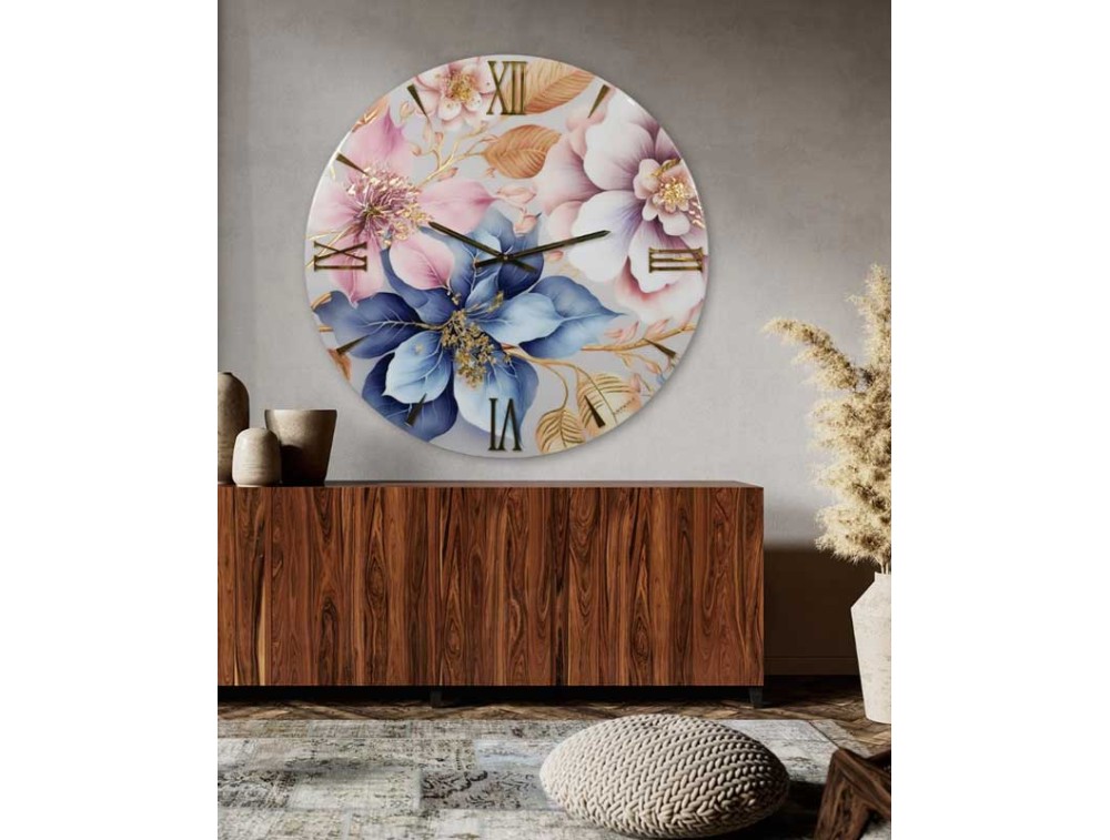 Runde Uhr mit poliertem Zifferblatt, handverziert mit Blattgold und überlappenden Ziffern aus poliertem Plexiglas mit Spiegeleffekt. Polierte Metallzeiger. Diese Uhr ist eine Hommage an die zarte Schönheit der Natur – ein Kunstwerk, das Ihrem Raum ein Gefühl von Sanftheit, Helligkeit und romantischem Luxus verleiht.