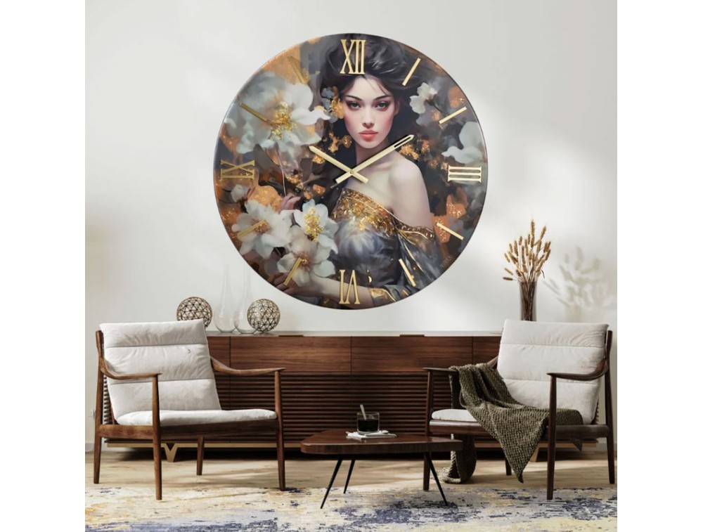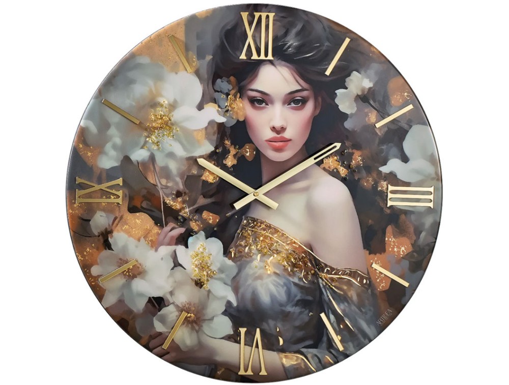 Runde Uhr aus gegossenem Holz mit glänzendem Zifferblatt, handverziert mit Blattgold und überlappenden Ziffern aus poliertem Plexiglas mit Spiegeleffekt. Polierte Metallzeiger. Ideal für Küchen, Wohnzimmer, Eingangsbereiche und Gewerberäume.