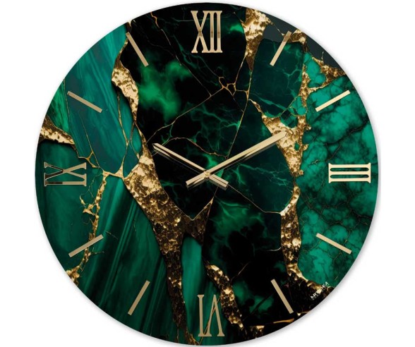 Handgefertigt in Italien mit starker dekorativer Ausdruckskraft. Der Holzsockel ist mit grünem Epoxidharz in Marmoroptik beschichtet, das durch die dynamische Maserung von handaufgetragenem Blattgold hervorgehoben wird und Brillanz und Tiefe verleiht. Jedes Stück ist ein Unikat mit einer UV-beständigen Oberfläche, die ihren Glanz über lange Zeit bewahrt. Die vergoldeten römischen Ziffern aus Plexiglas und die goldverchromten Metallzeiger runden das Design mit einer eleganten und edlen Note ab. Ausgestattet mit einem Contini Firenze Uhrwerk.