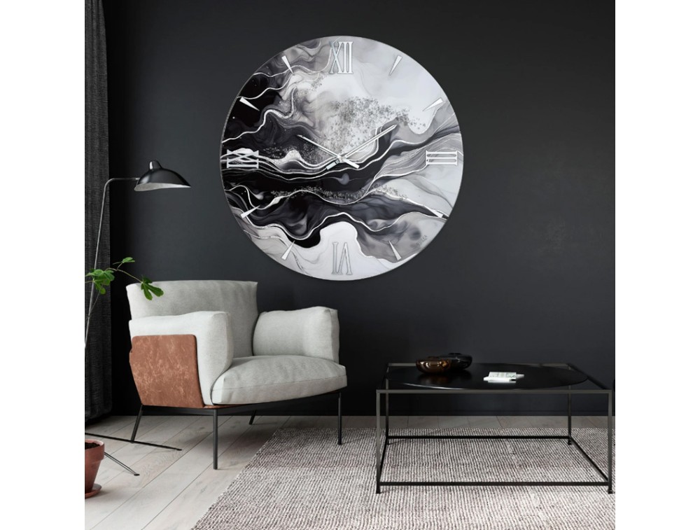 Eine optisch beeindruckende Wanduhr, perfekt für Räume mit markantem und elegantem Charakter. Die auf einem HDF-Holzsockel gefertigte Harzoberfläche ist mit einem intensiven, fließenden Muster in Schwarz-, Grau- und Weißtönen verziert, das durch edles Blattsilber und Kristalleinsätze, die das Licht brillant einfangen, noch verstärkt wird. Die verspiegelten römischen Ziffern aus silbernem Plexiglas strahlen dezente Eleganz aus, während die silberverchromten Metallzeiger das Design mit einem schlichten, modernen Stil abrunden. Ideal für Wohnzimmer, Eingangsbereiche und moderne Räume. Mechanik „Made in Italy“.