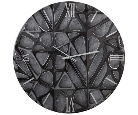 Kombiniert ein geometrisches Gittermuster mit einer Marmor-Hintergrundstruktur. Runde Uhr mit poliertem Zifferblatt, handverziert mit Blattgold und überlappenden Ziffern aus poliertem Plexiglas mit Spiegeleffekt. Polierte Metallzeiger sorgen für optischen Kontrast und gute Ablesbarkeit auf dem Gehäuseboden.