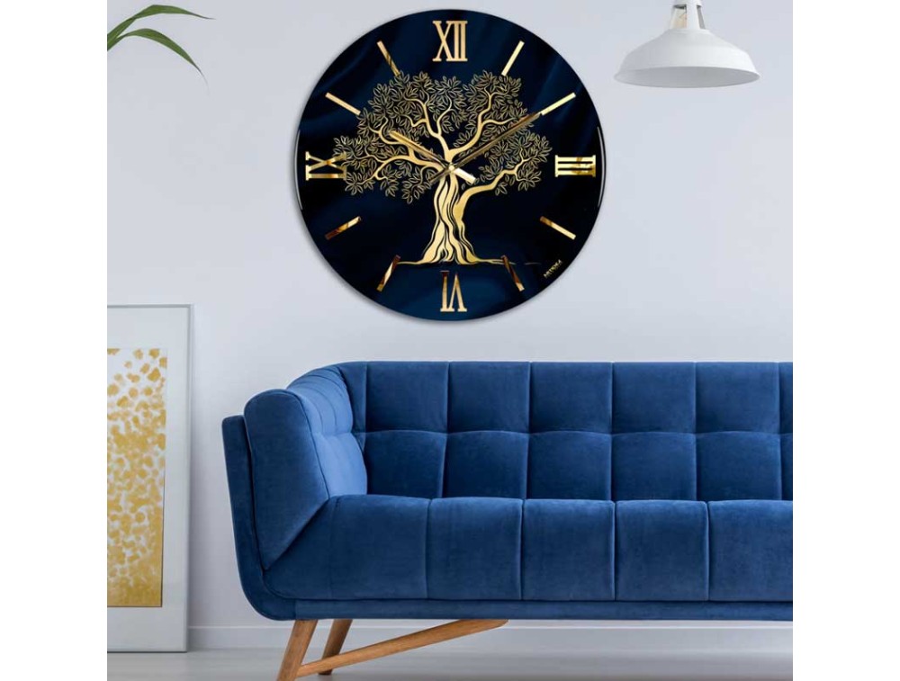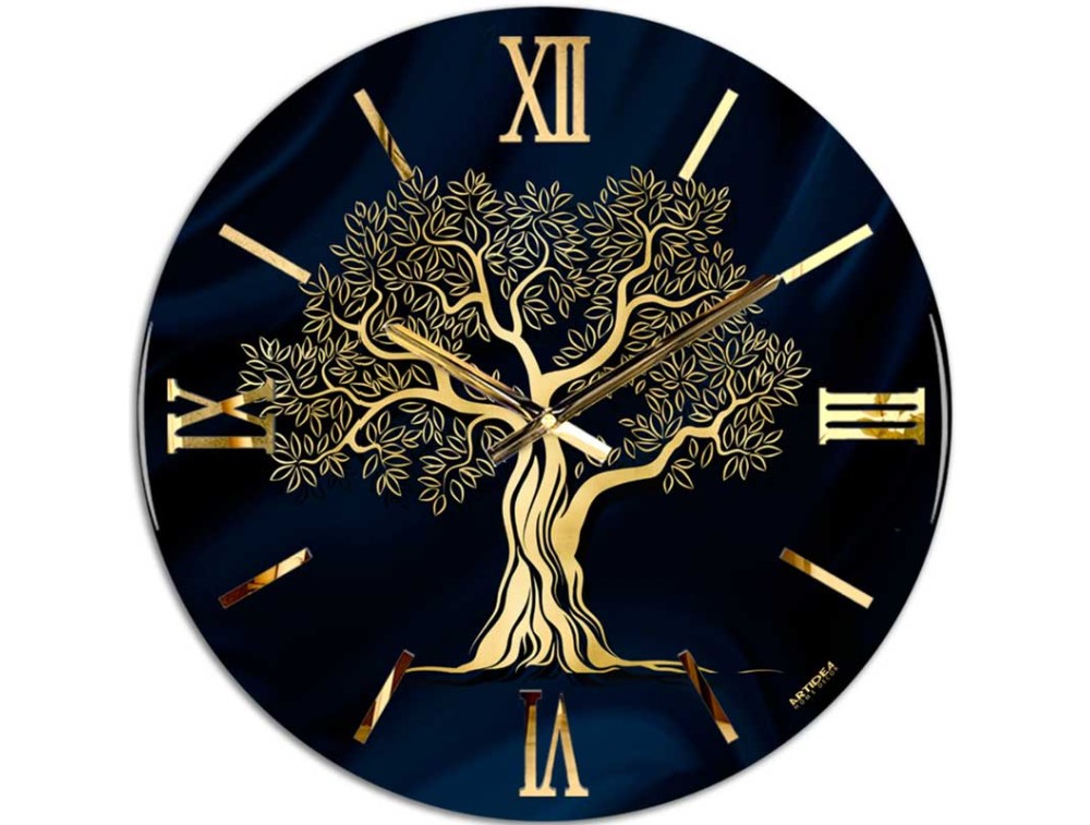 Komplett handgefertigt in Italien mit Holzsockel und glänzendem Gießharz. Die runde Uhr hat ein glänzendes Zifferblatt, verziert mit Blattgold und überlappenden Ziffern aus poliertem Plexiglas mit Spiegeleffekt. Polierte Metallzeiger. Das zentrale Thema ist der Olivenbaum, ein Symbol für Stärke, Wachstum und Verbundenheit. Der Stil ist luxuriös, minimalistisch in der Farbgebung und dennoch reich an dekorativen Details.