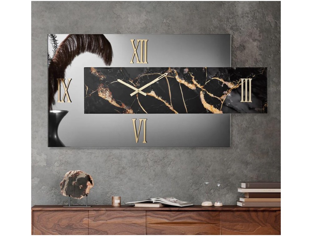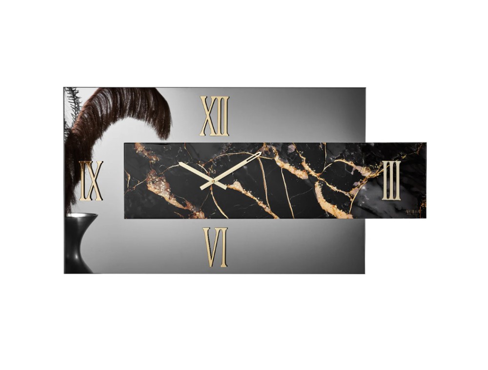 Rechteckige Uhr, handverziert mit Blattgold und überlappenden Ziffern aus poliertem Plexiglas mit Spiegeleffekt. Polierte Metallzeiger. Ideal für Küchen, Wohnzimmer, Eingangsbereiche und Gewerberäume.