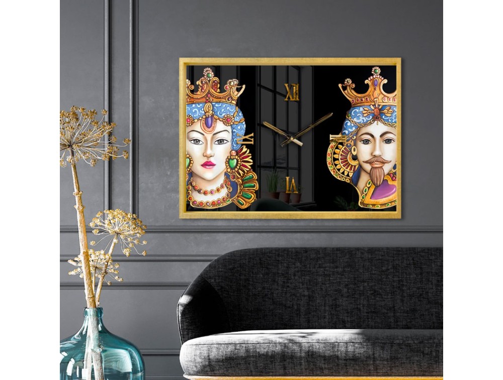 Rechteckige Wanduhr mit Goldrahmen und markantem Design, das zwei sizilianische Keramikköpfe (Mohrenköpfe) darstellt. Handverziert mit Blattgold. Die Oberfläche aus glänzendem Harz verleiht dem Stück leuchtende Farben und einen einzigartigen Glanz.