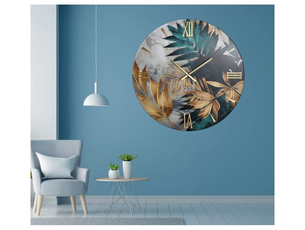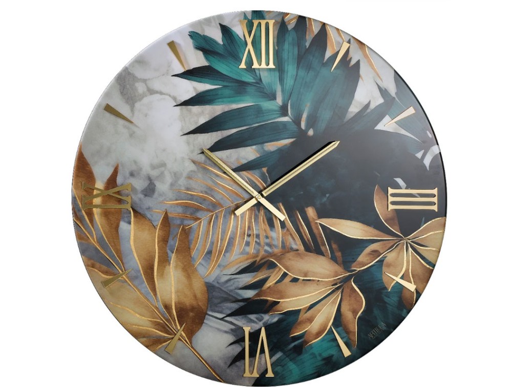 Runde Uhr aus gegossenem Holz mit glänzendem Zifferblatt, handverziert mit Blattgold und überlappenden Ziffern aus poliertem Plexiglas mit Spiegeleffekt. Polierte Metallzeiger. Ideal für Küchen, Wohnzimmer, Eingangsbereiche, Arbeitszimmer und Hotellobbys.