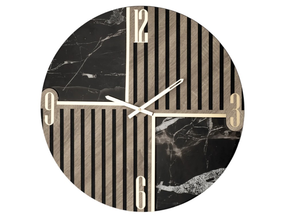 Eine große Wanduhr mit originellem, grafischem Design, ideal für moderne Räume, die unkonventionelle Dekorationslösungen suchen. Das runde Zifferblatt ist in vier Abschnitte unterteilt, die sich elegant mit geripptem Holz und Marmoreffekt-Einsätzen abwechseln und so ein lebendiges Spiel aus optischen Kontrasten und Texturen erzeugen. Sie verleiht der Uhr Helligkeit und Eleganz und verleiht ihr einen modernen Touch. Der Versand ist kostenlos, die Garantie beträgt 2 Jahre.