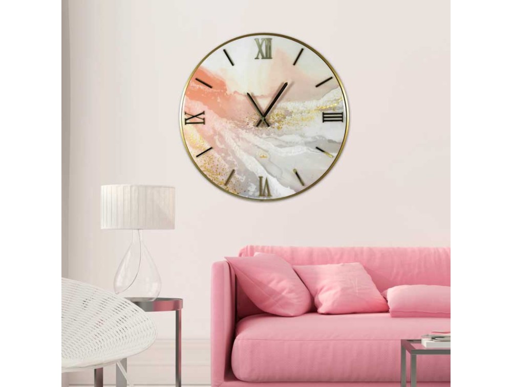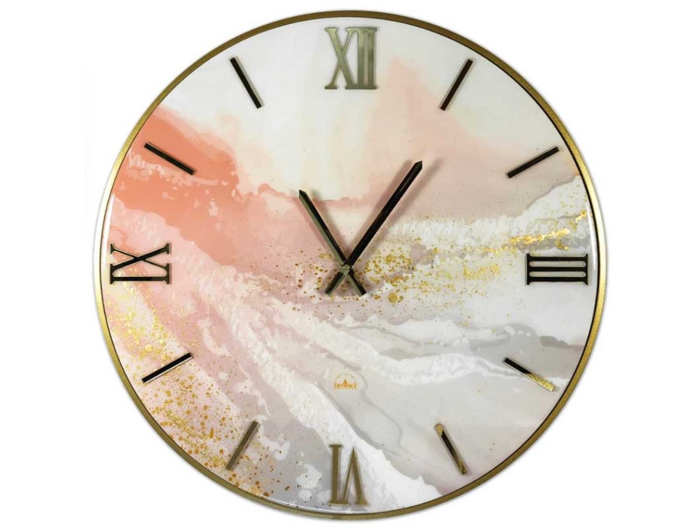 Runde Uhr mit poliertem Zifferblatt, handverziert mit Blattgold und überlappenden Ziffern aus poliertem Plexiglas mit Spiegeleffekt. Polierte Metallzeiger. Gefertigt mit einem Holzsockel und poliertem Kunstharz. Uhrwerk von Contini Firenze.