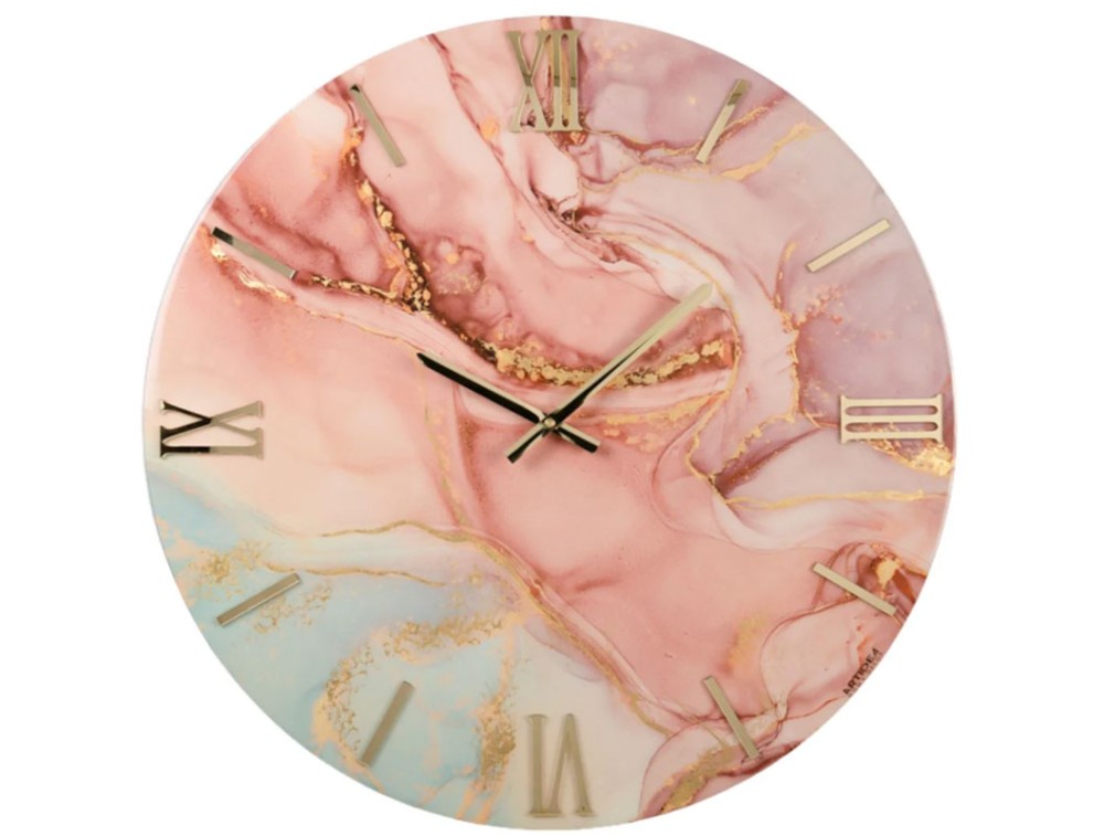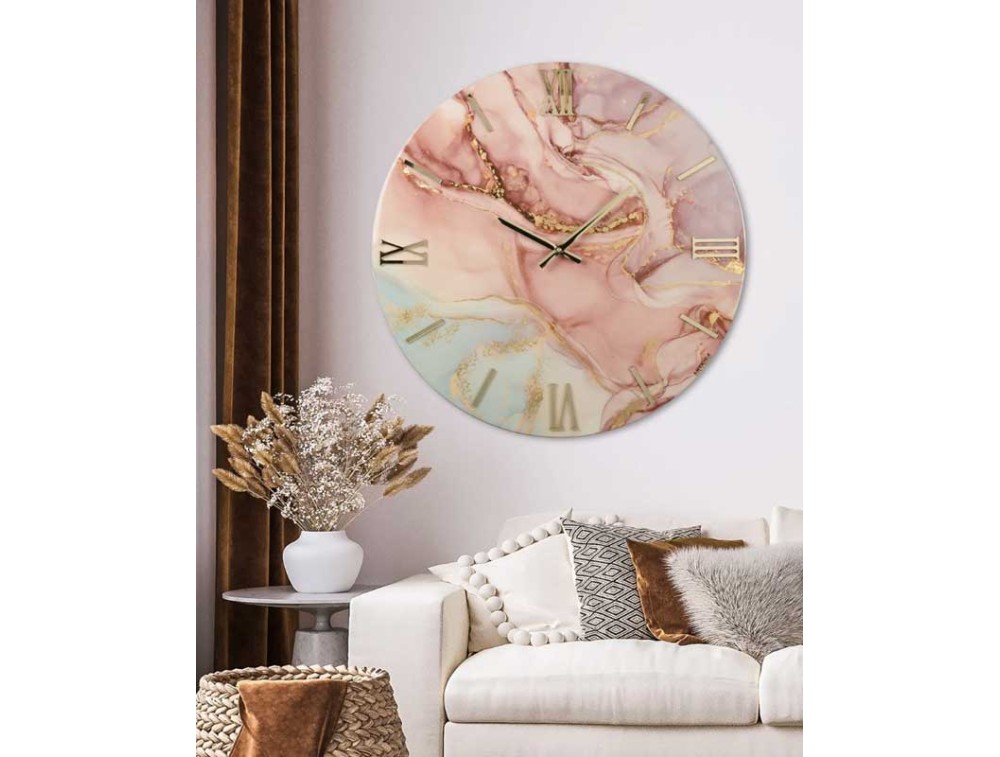 Mit ihrem modernen und unverwechselbaren Design ist sie ein wahrhaft künstlerischer Ausdruck für die individuelle Gestaltung zeitgenössischer Räume. Das auf einem HDF-Holzsockel gefertigte, glänzende Zifferblatt ist handverziert mit eleganten Rosatönen und Blattgolddetails, die einen raffinierten Kontrast bilden. Die vergoldeten römischen Ziffern aus Plexiglas harmonieren harmonisch mit dem Zifferblatt, während die vergoldeten Metallzeiger für Brillanz und Präzision sorgen. Ein einzigartiges Stück, das Wohnzimmer, Schlafzimmer und Wohnbereiche stilvoll verschönert.
