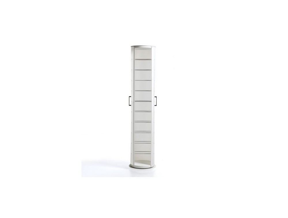 Emporium-Möbel, drehbare Schuhablage aus Polypropylen mit 11 Fächern. Sockel und Platte aus weiß lackiertem Metall.