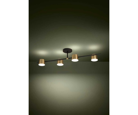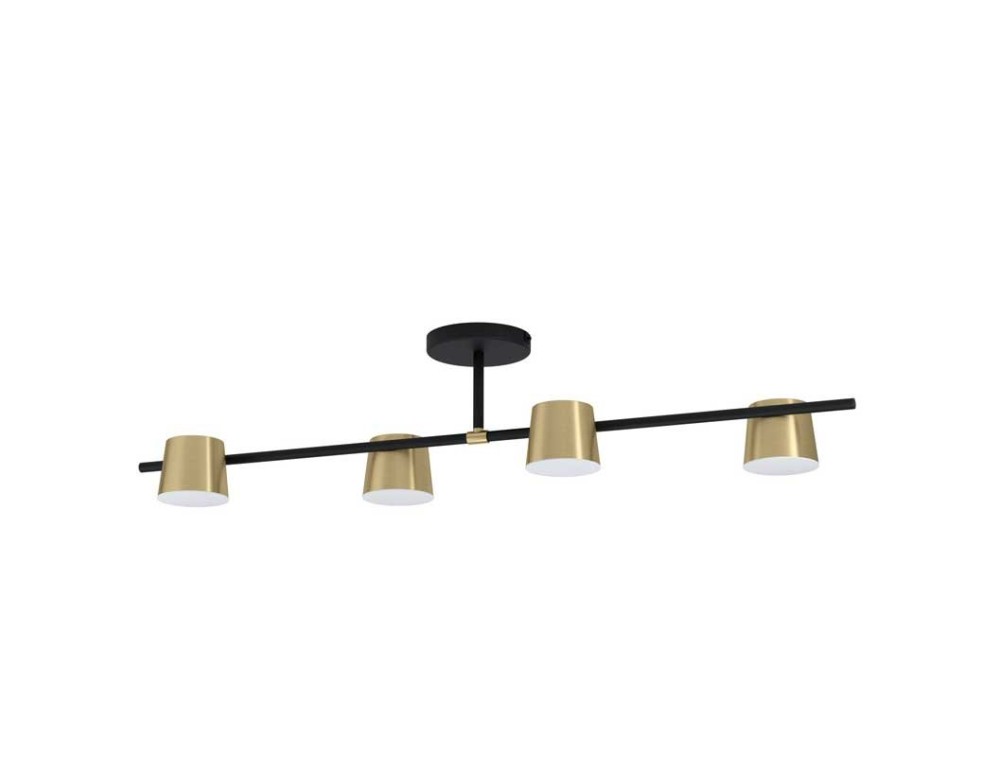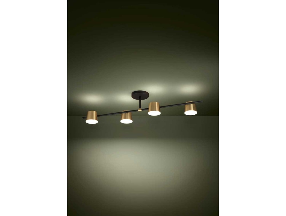 Deckenleuchte bestehend aus einem schwarzen Metallsockel, an den ein langer, gleichfarbiger Metallträger angebaut ist, auf dem sich vier abwechselnd angeordnete Lampenschirme aus gebürstetem Messing befinden. Die integrierten LED-Leuchtmittel strahlen ein angenehm warmweißes Licht aus und werden durch den weißen Diffusor am Lampenschirm gut verdeckt