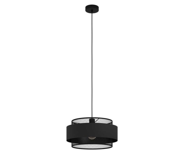 Die Pendelleuchte BAZELY besteht aus einem runden Lampenschirm mit schwarzem Streckmetallgeflecht, das von einem gleichfarbigen Stoffband umgeben ist. Der Schirm hängt an einer hochwertigen schwarzen Stoffschnur an einem runden, schwarzen Baldachin.