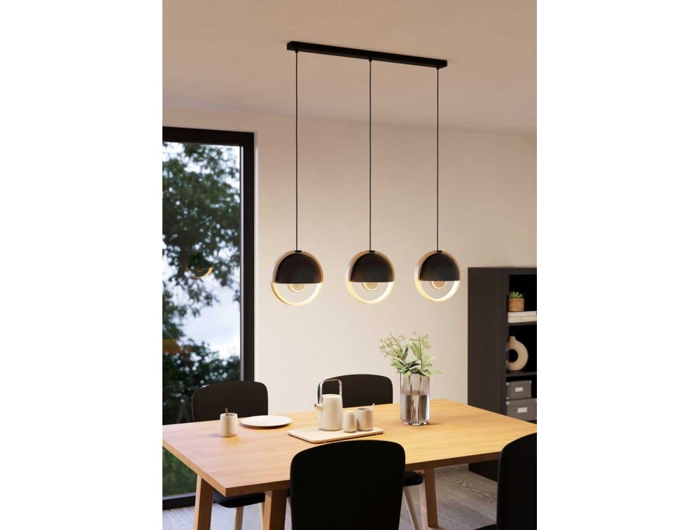 Die Pendelleuchte CALLOW besteht aus einem runden Lampenschirm aus schwarzem Metall und einem umlaufenden Holzring. Das besondere Design dieser Lampe eignet sich ideal für Innenräume im modernen oder skandinavischen Stil.