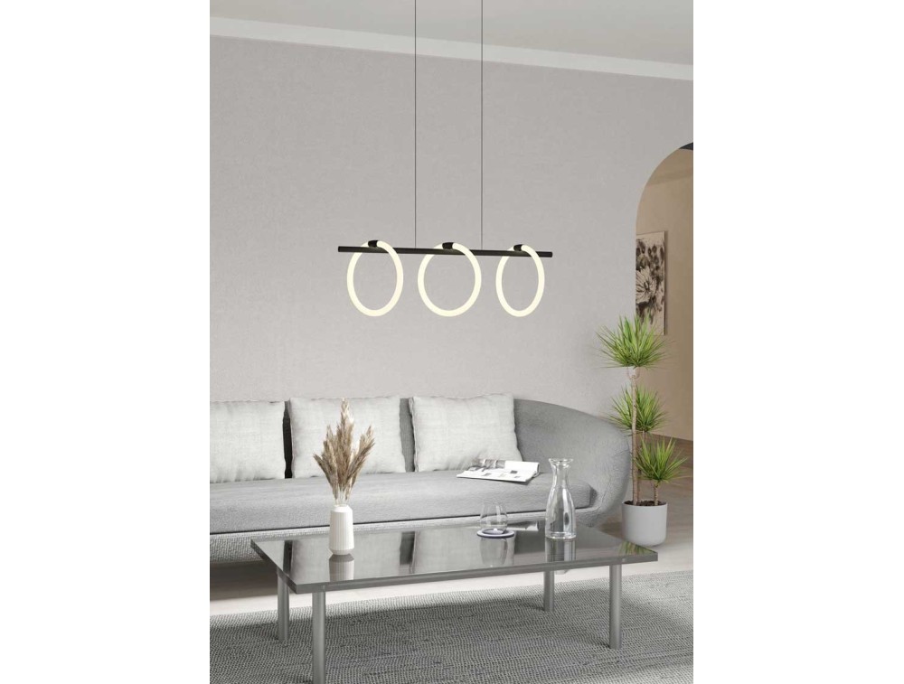 Moderner Design-Kronleuchter aus schwarzem Stahl mit weißen Polycarbonat-Diffusoren, aus denen das LED-Licht austritt