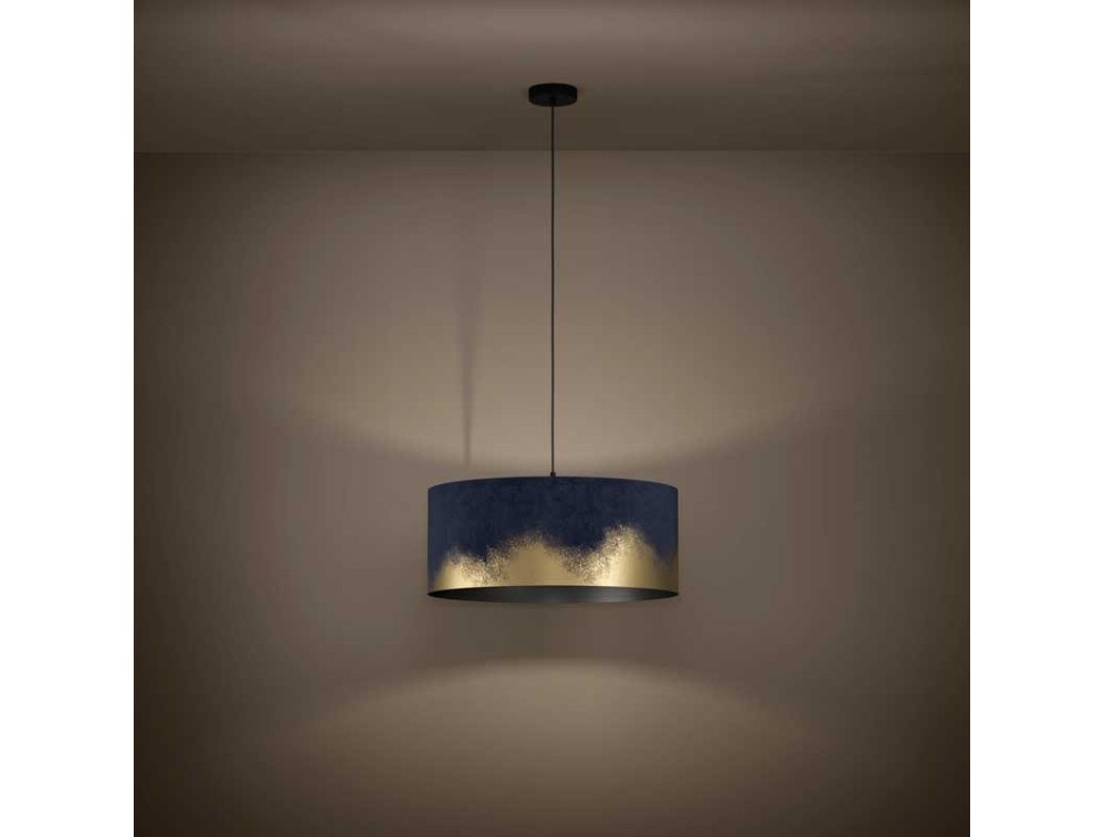 Aufhängung bestehend aus einem runden Lampenschirm aus dunkelblauem Samt mit handbemalten goldenen Schirmen. Der Samt-Lampenschirm ist mit einer schwarzen Innenseite mit transparenter Folie und einem hochwertigen schwarzen Stoffkabel ausgestattet und zeichnet sich durch eine elegante Optik mit Retro-Charme aus