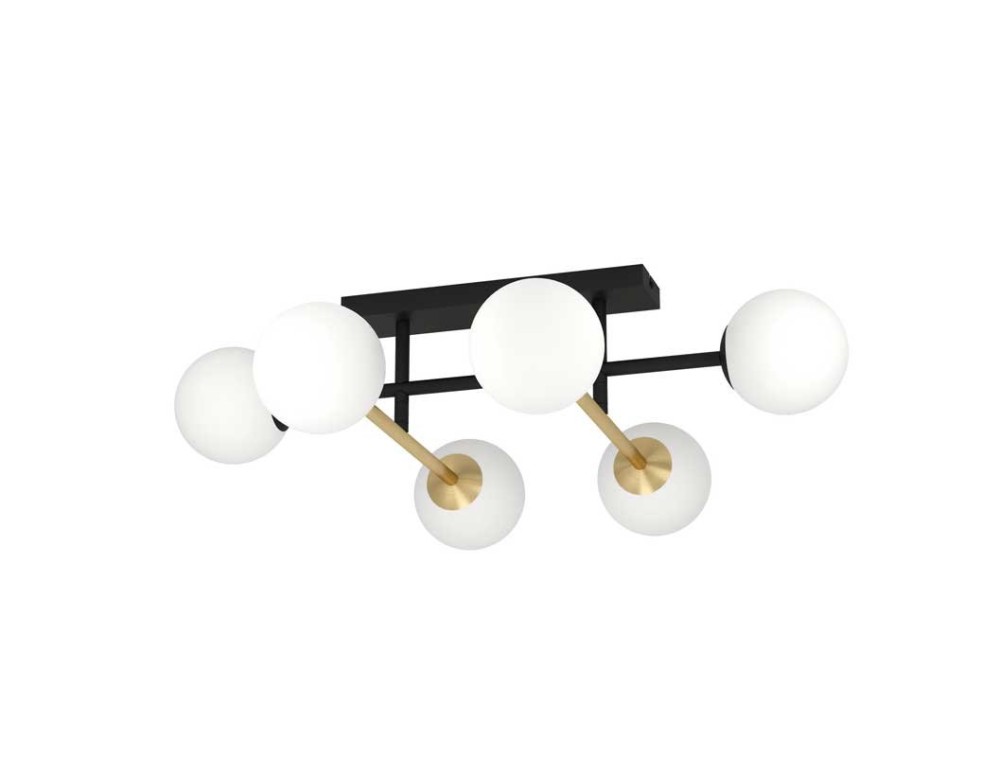 Deckenleuchte mit Struktur aus schwarzem Stahl und gebürstetem Messing, kugelförmiges Glas in geätztem Weiß. Leuchtmittel des Modells E14 nicht im Lieferumfang enthalten, aber jederzeit austauschbar