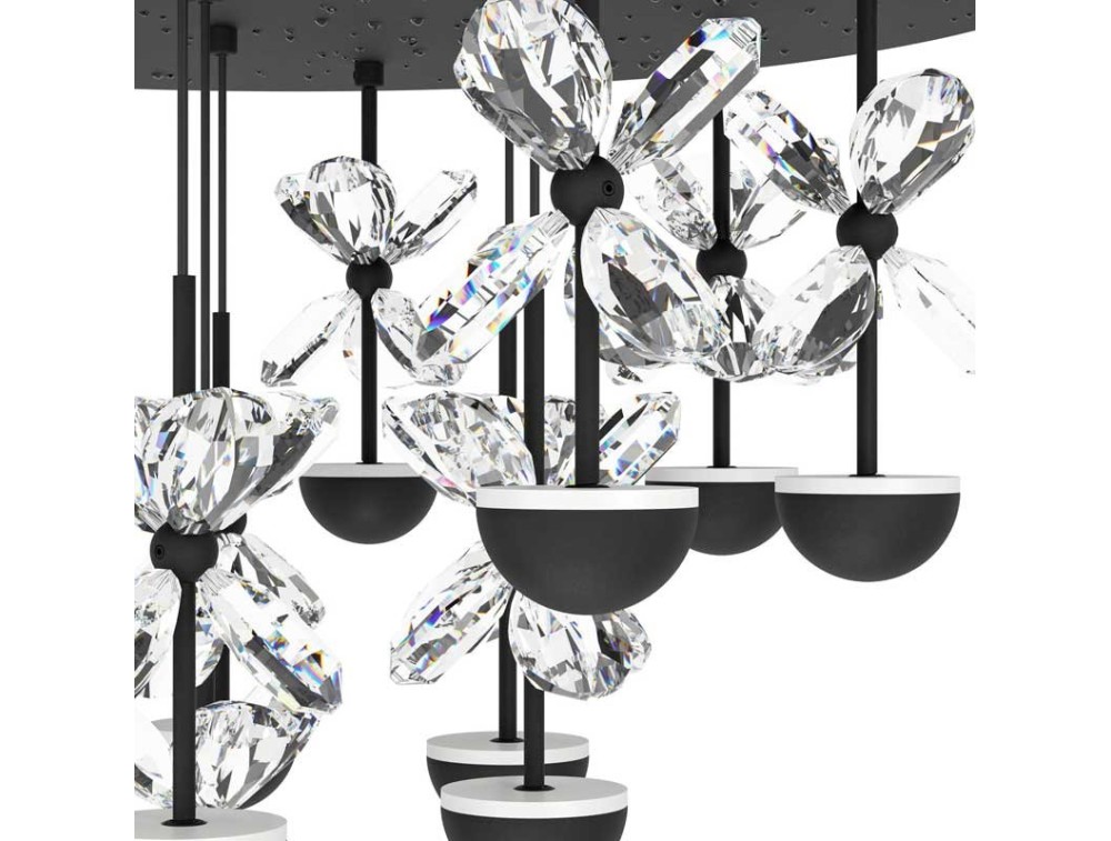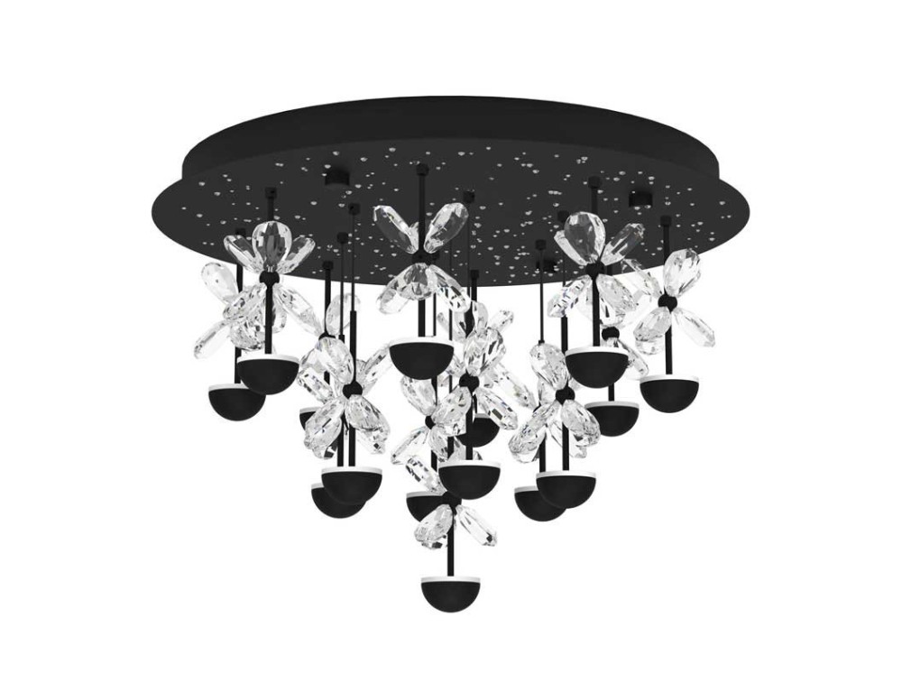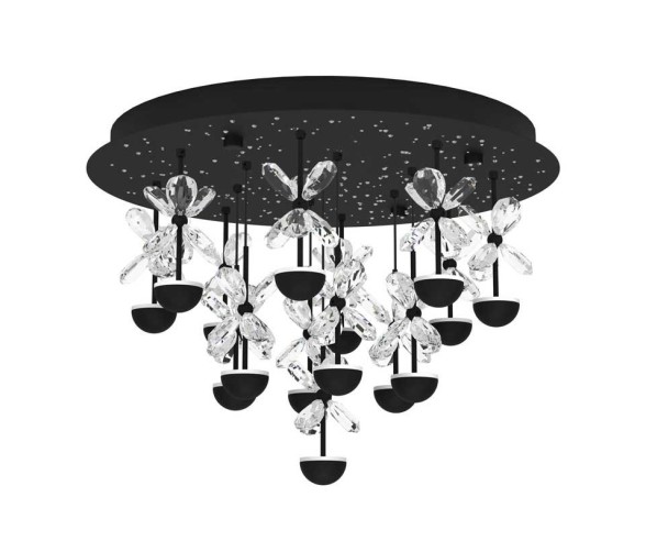 Deckenleuchte mit integriertem warmweißem LED-Licht, schwarzer Stahlstruktur und Kristallelementen