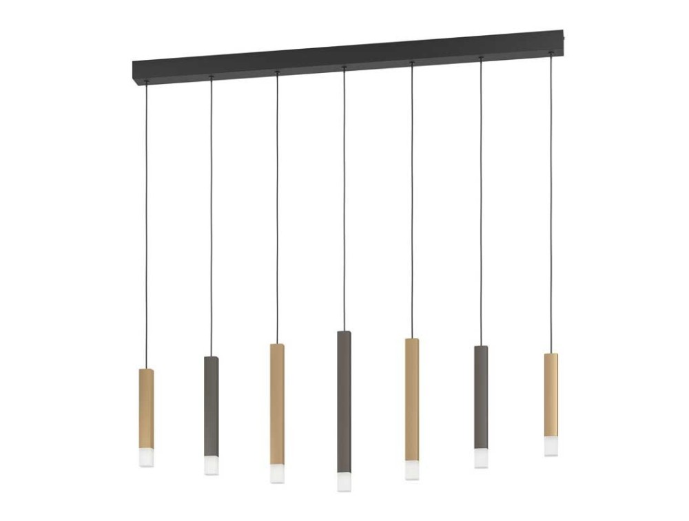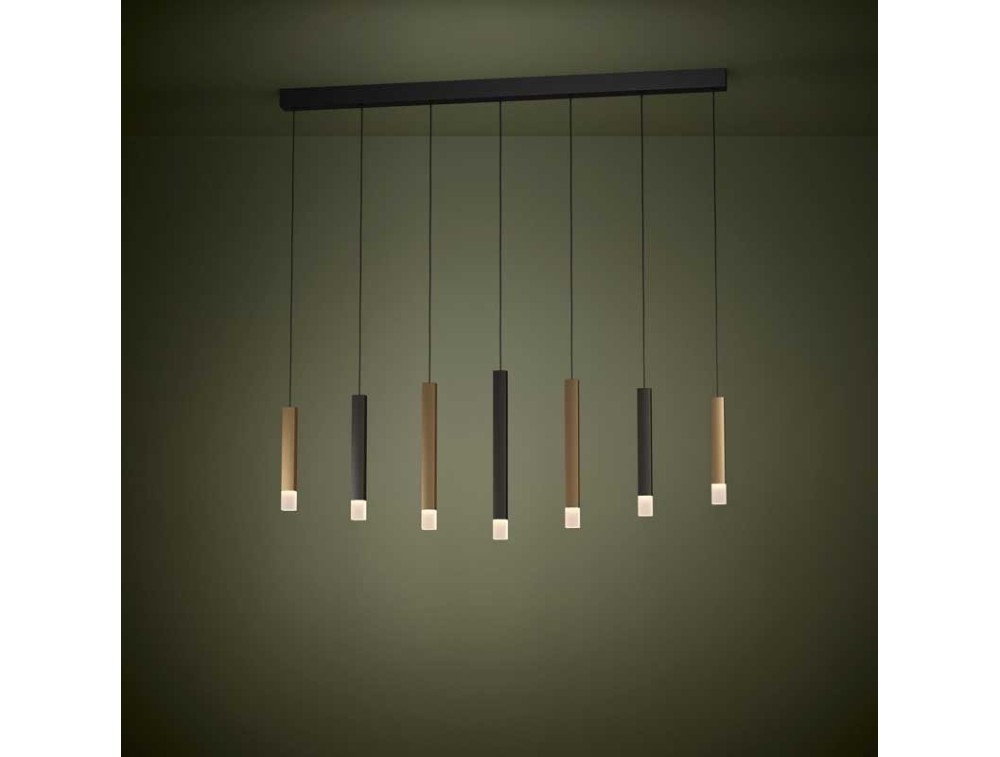 Die LED-Pendelleuchte ESTANTERIOS besteht aus sieben unterschiedlich langen Metallsäulen in Gold und Dunkelbraun und wird von einem schwarzen Metallpendel begleitet.