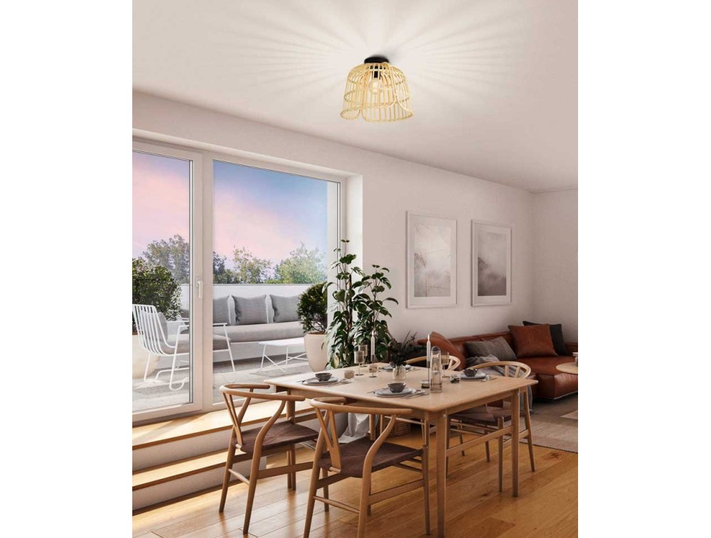 Deckenleuchte, ideal für eine Küche, ein Wohnzimmer oder über einem Esstisch / einer Halbinsel. Struktur aus schwarzem Stahl und Diffusor aus Naturholz.
