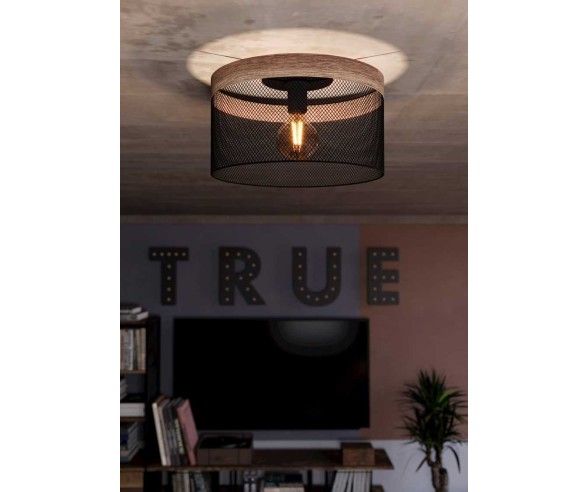 Deckenleuchte aus schwarzem Stahl und braunem Holz, ideal für Küche, Wohnzimmer oder Esszimmer.