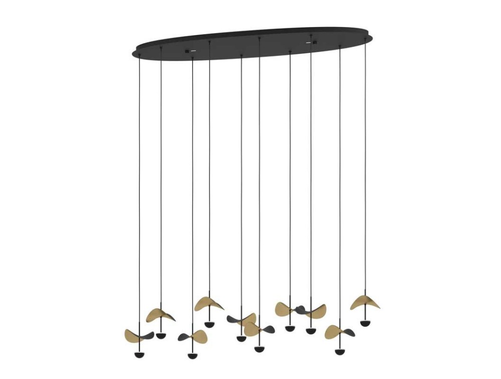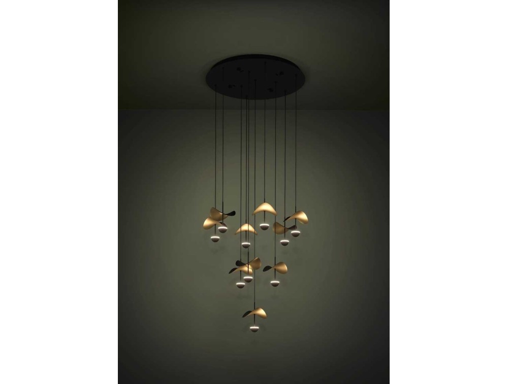 Moderner Design-Kronleuchter mit schwarzer Stahlstruktur und schwarzen und goldenen Elementen. Dimmbare LED der neuesten Generation.