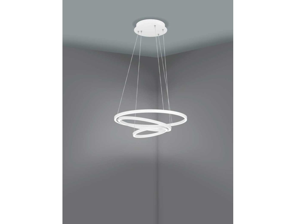 Die LED-Pendelleuchte LOBINERO-Z aus der Smart-Home-Leuchtmittelserie connect.Z besteht aus weißem Metall mit drei ringförmig aufgehängten LED-Profilen. Der Winkel der Ringe lässt sich individuell anpassen. Die integrierten LEDs sorgen für angenehmes Licht ganz nach Ihren Wünschen.