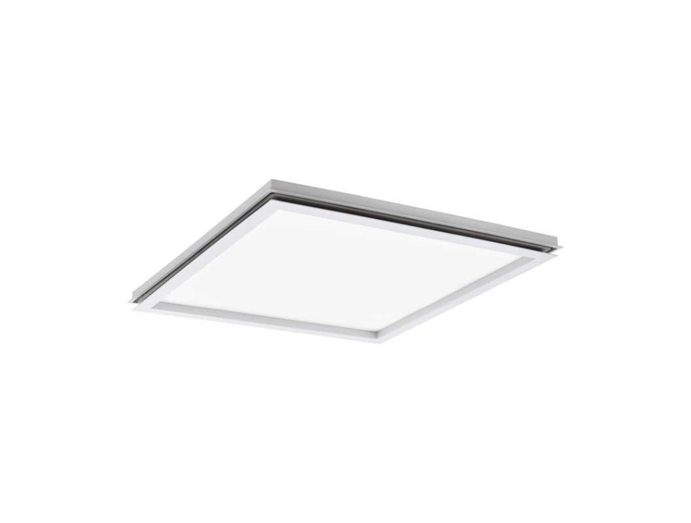 Die Deckenleuchte hat einen weißen Metallsockel mit einer quadratischen weißen Kunststoffoberfläche. Die Lampe ist mit einem internen Lichtring ausgestattet, der sie umgibt und beim Einschalten der Lampe indirektes RGB-Licht abgibt.