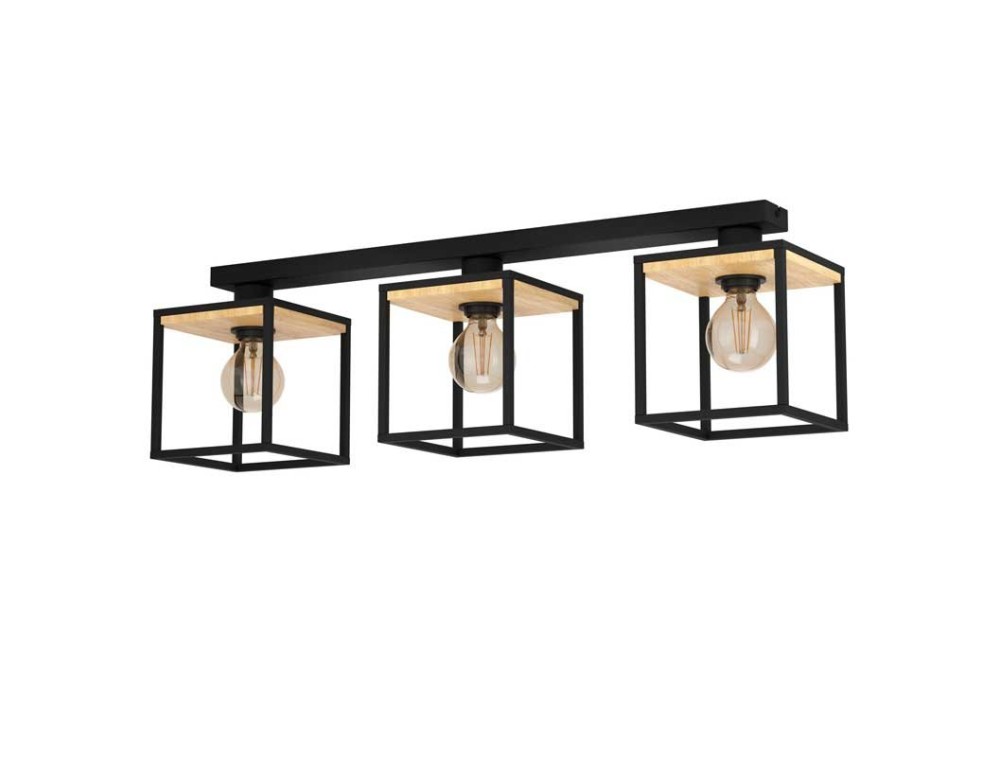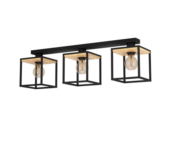 Die Deckenleuchte LIBERTAD besteht aus drei schwarzen Metallrahmen, die jeweils von einer dekorativen Platte aus Ficusholz begleitet werden. Die freigelegten inneren Stützen unterstreichen den minimalistischen Look der Lampe