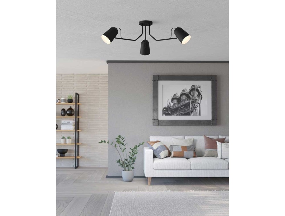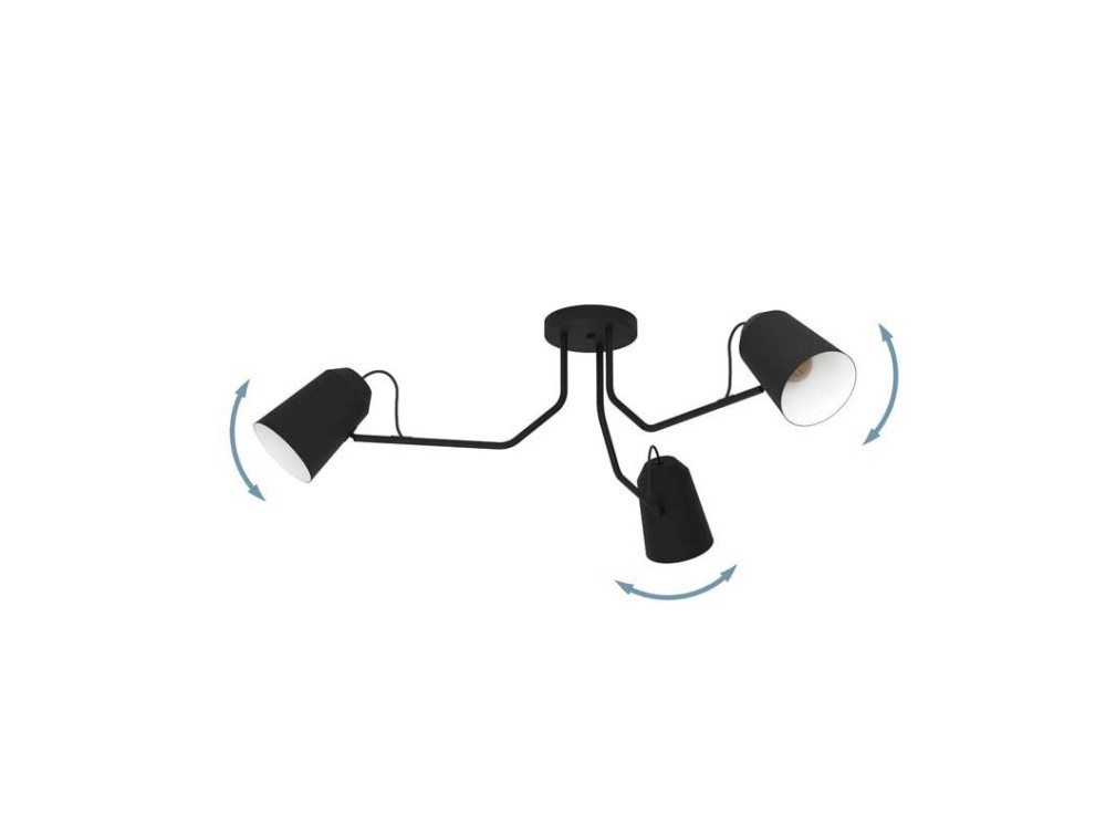Die Deckenleuchte LORETO besteht aus schwarzem Metall mit drei Armen und beweglichen Köpfen mit mattweißer Innenseite. Die beweglichen Elemente ermöglichen es Ihnen, die Umgebung nach Ihren Wünschen zu beleuchten.