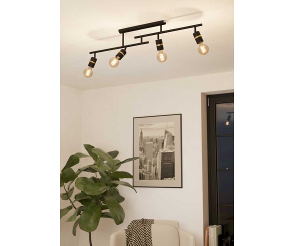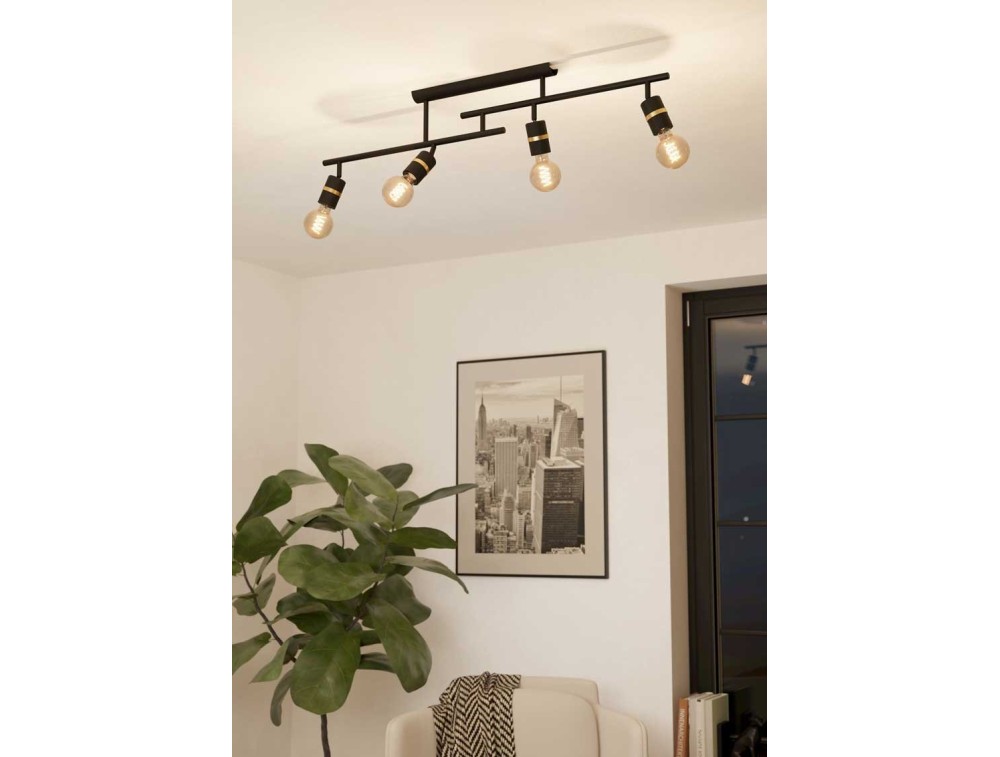 Die Deckenleuchte LURONE besteht aus einem schwarzen Metallfuß und zwei Metallarmen mit vier verstellbaren Strahlern. Die messingfarbenen Ringe an den Spotköpfen verleihen der Lampe ein edles Aussehen.