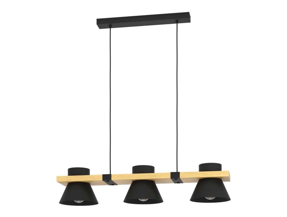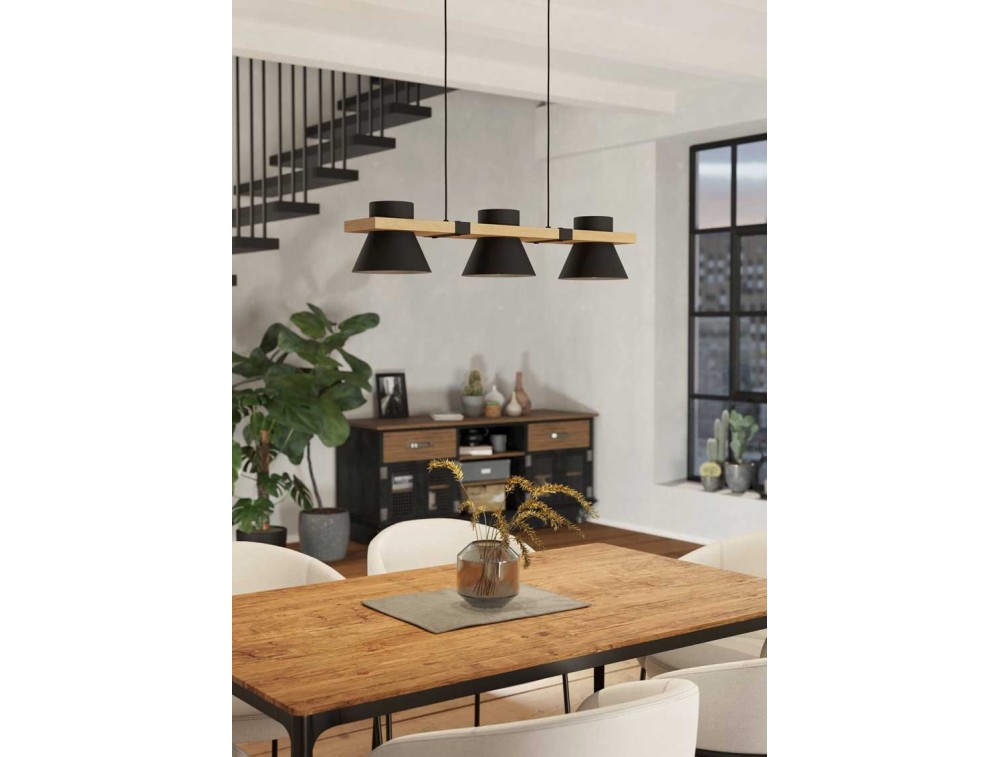 Kronleuchter aus schwarzem Stahl und braunem Holz mit Diffusoren, die einen Küchentisch, eine Theke oder eine Halbinsel direkt beleuchten.