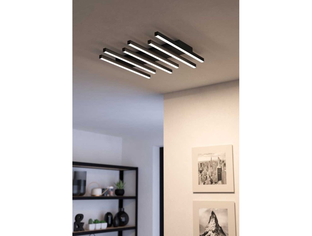 Deckenleuchte, ideal für eine mittelgroße Küche oder ein Wohnzimmer, aus schwarzem Aluminium mit weißem Polycarbonat-Diffusor, aus dem das LED-Licht austritt. LED dimmbar per Fernbedienung.