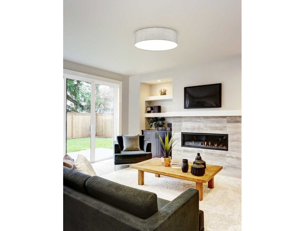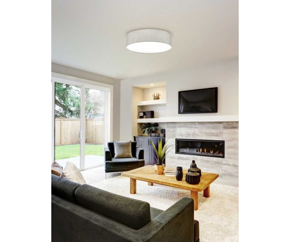 Die Deckenleuchte PASTERI besteht aus einem runden Lampenschirm aus braunem Leinenstoff und einem weißen, grauen oder taubengrauen Diffusor. Mit seinem schlichten Design und 57 cm Durchmesser eignet er sich für moderne Umgebungen.