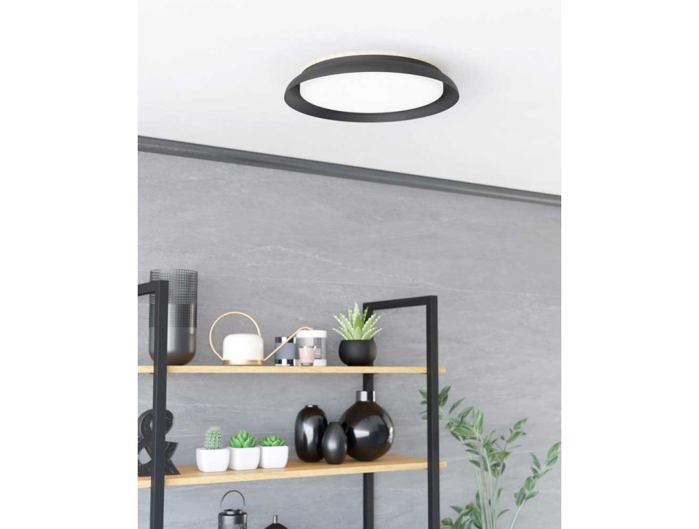 Deckenleuchte, ideal für Küche oder Wohnzimmer, aus schwarzem Stahl und braunem Holz. Integrierte LED mit 5 Jahren Garantie.