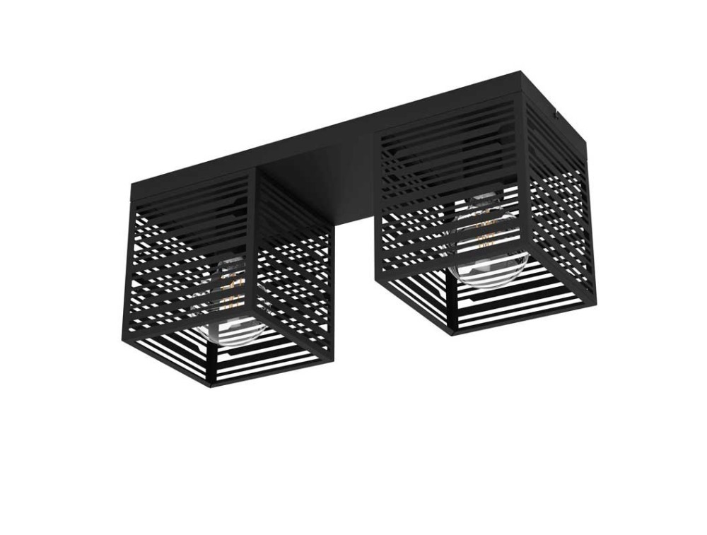 Die Deckenleuchte PIEDRITAS ist aus schwarzem Metall gefertigt und besteht aus zwei würfelförmigen Körpern mit beidseitig so breiten Ausschnitten, die aus einem dünnen Sockel herausragen.